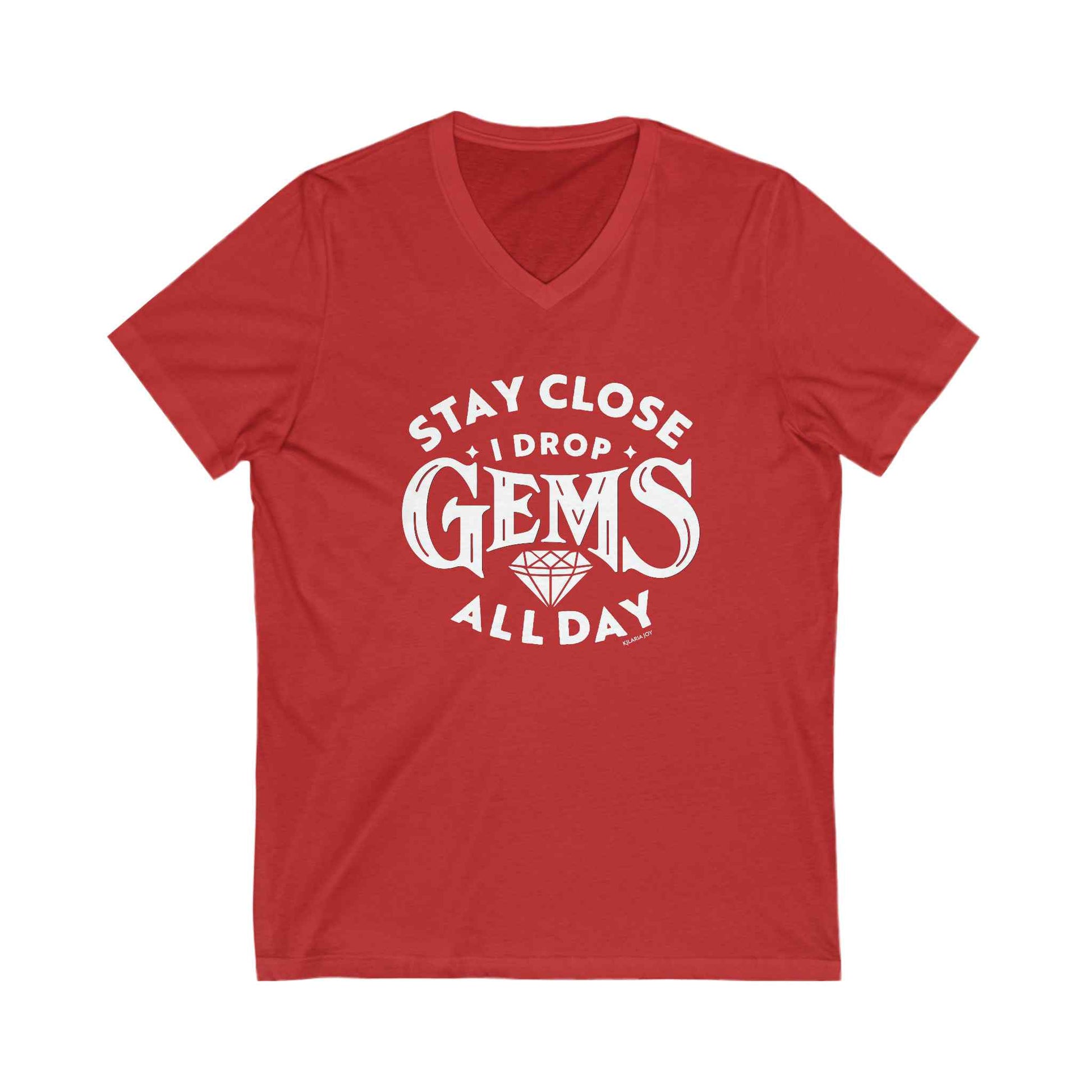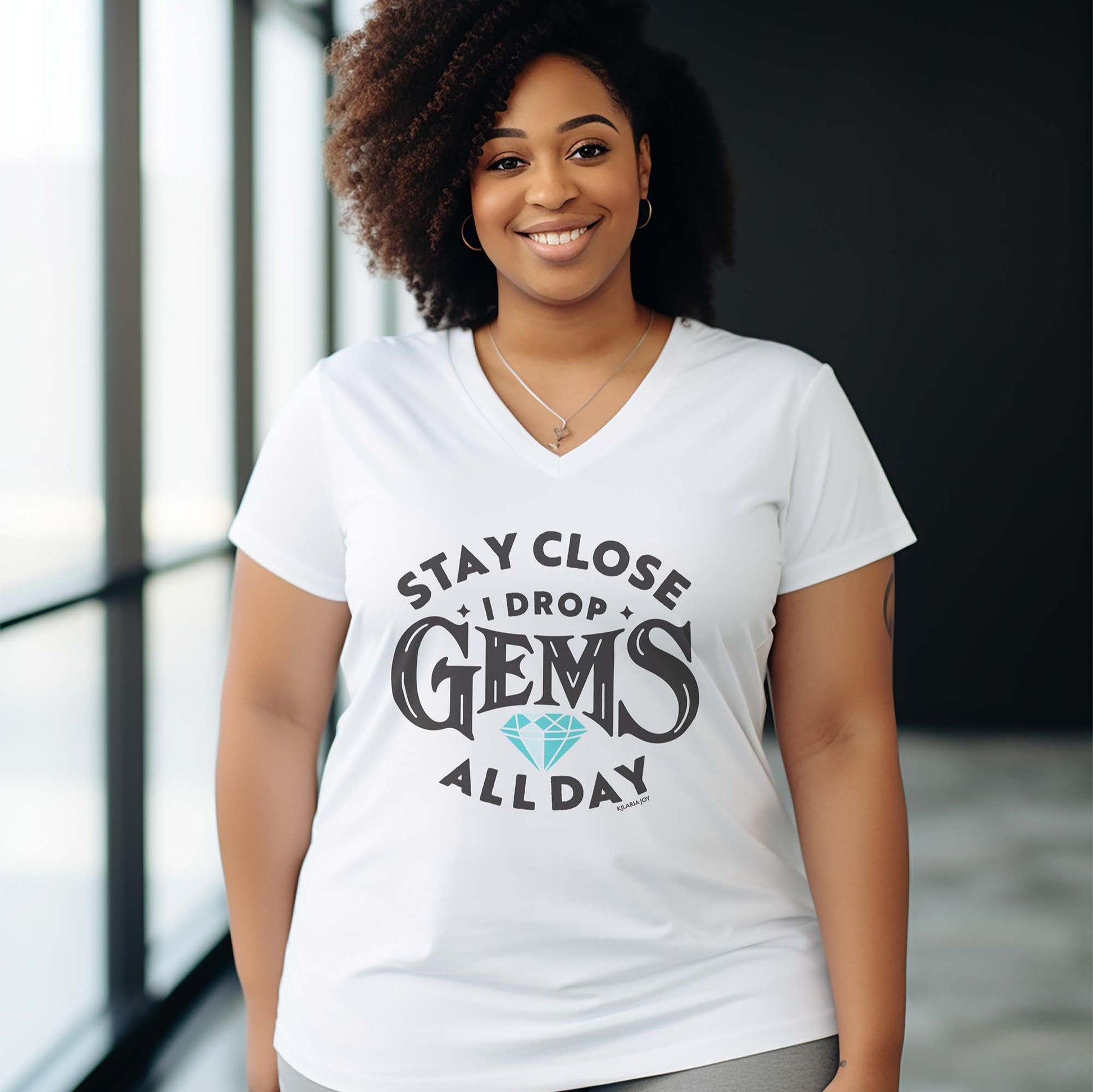 Step up your wardrobe with our Stay Close. I Drop Gems All Day Women's Premium V-neck T-shirt, made of luxurious premium quality fabric. Enjoy the softness and comfort of this 100% cotton jersey fabric while flaunting a style that's uniquely you. This tee goes beyond the basics with a highly elastic ribbed knit collar and twill-tape shoulder seams, ensuring it stands the test of time without losing its shape or elegance. Grab yours now and let the world know you're not just talking; you're dropping gems!