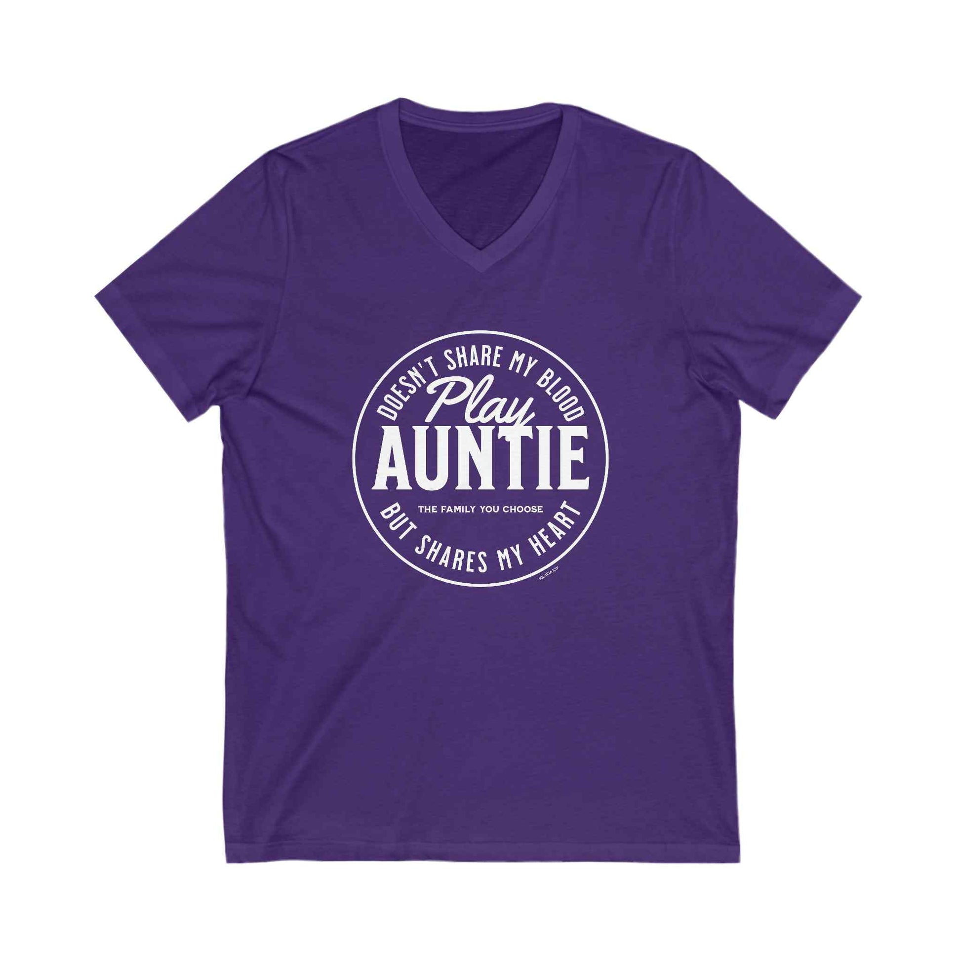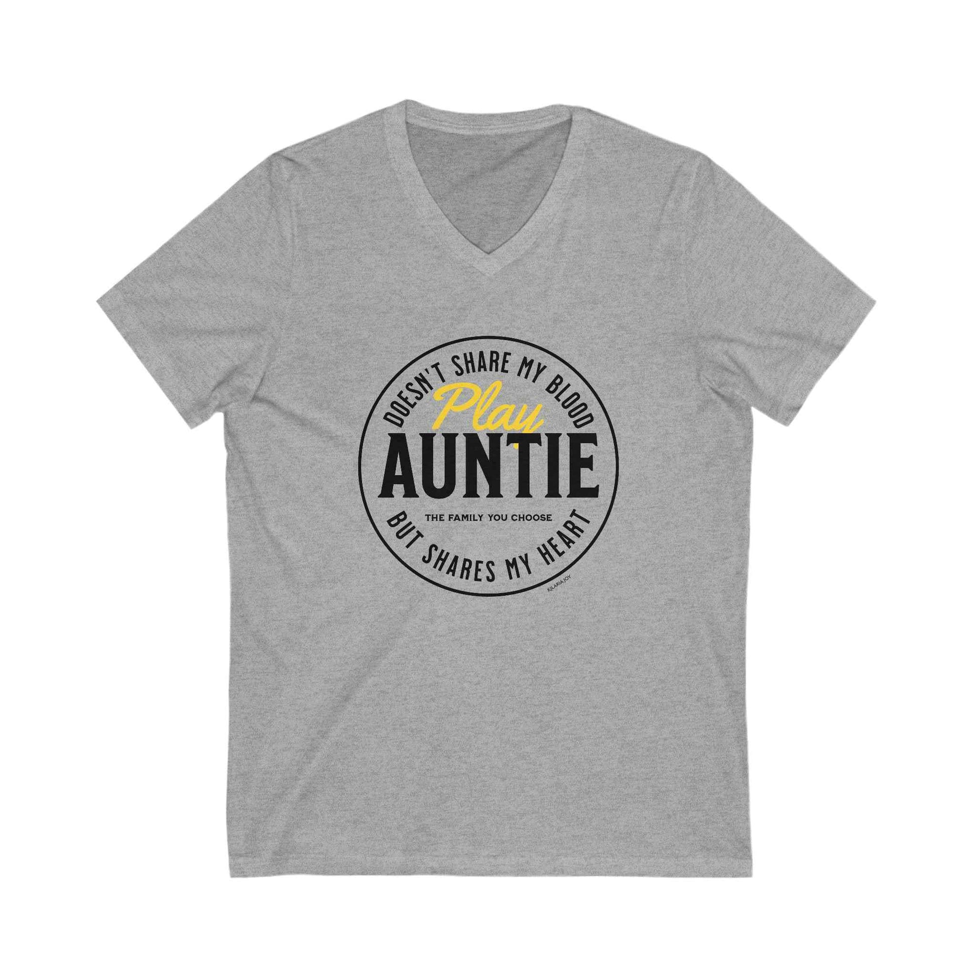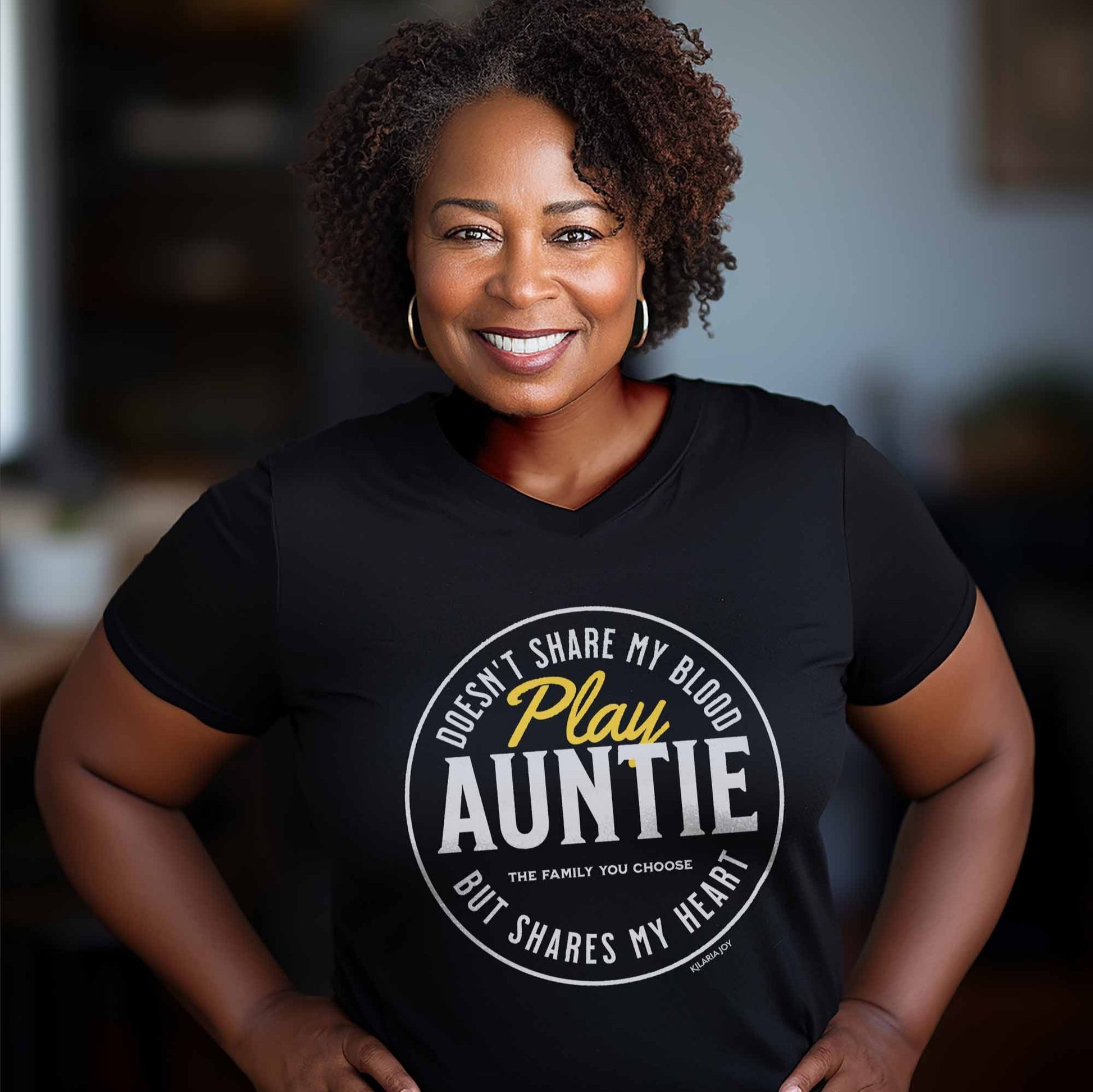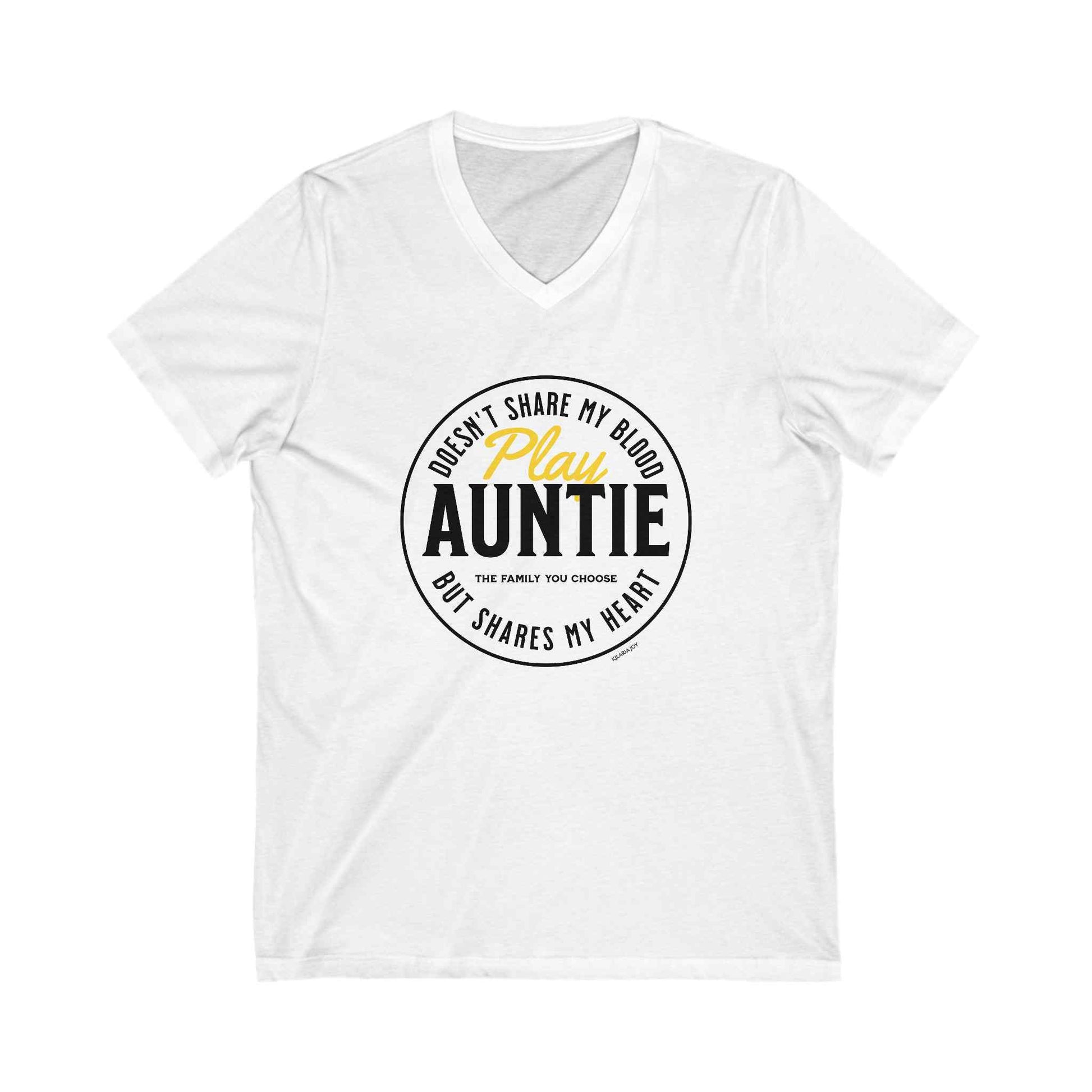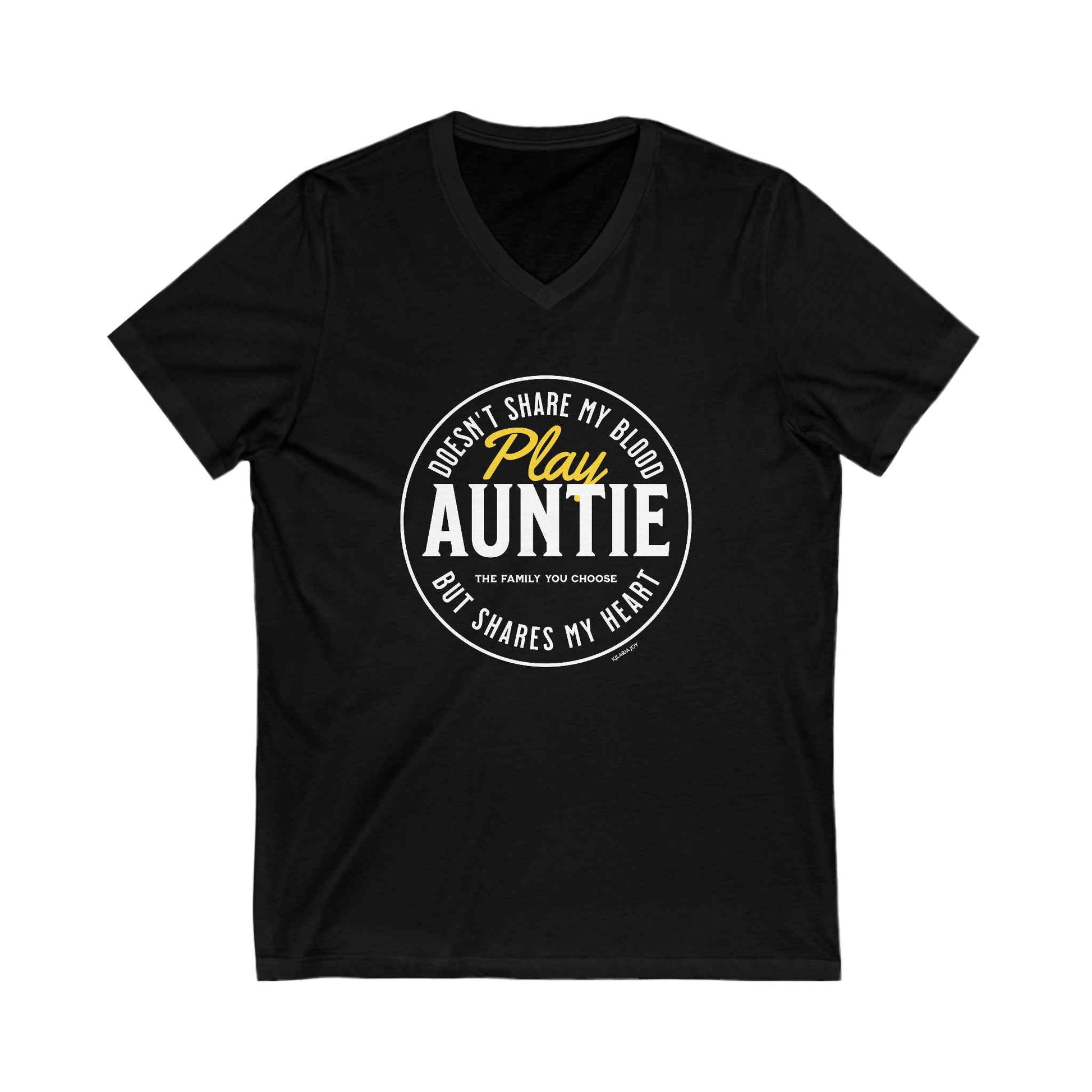 Our Play Auntie Premium V-neck T-shirt, made of luxurious premium quality fabric, is a celebration of our favorite aunties. This shirt is a testament to the bonds that are as strong as family ties. Enjoy the softness and comfort of this 100% cotton jersey fabric, this shirt offers a soft, comfortable fit that's perfect for everyday wear. It isn't just a piece of clothing - it's a celebration of love, unity, and the power of who your mama says is your auntie.