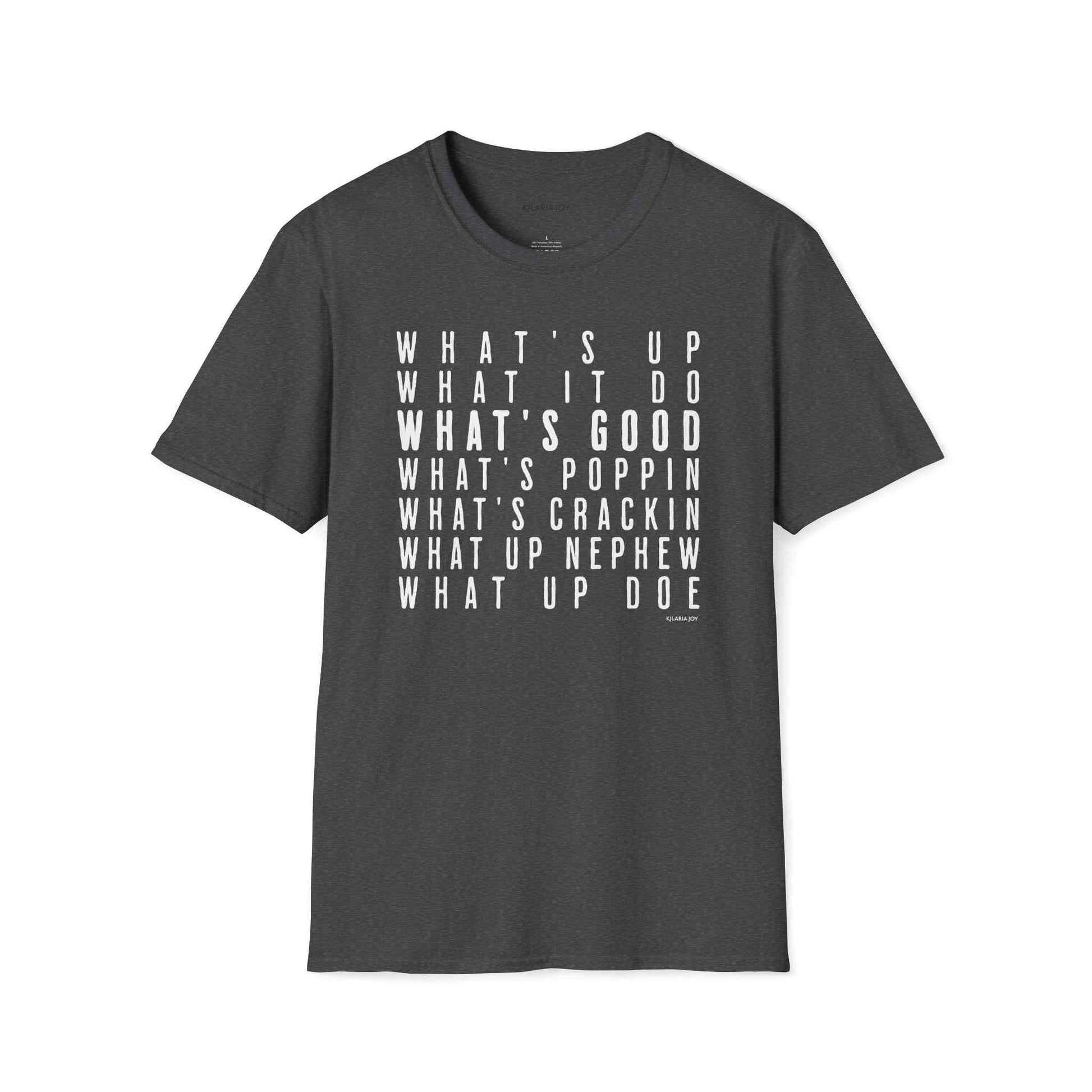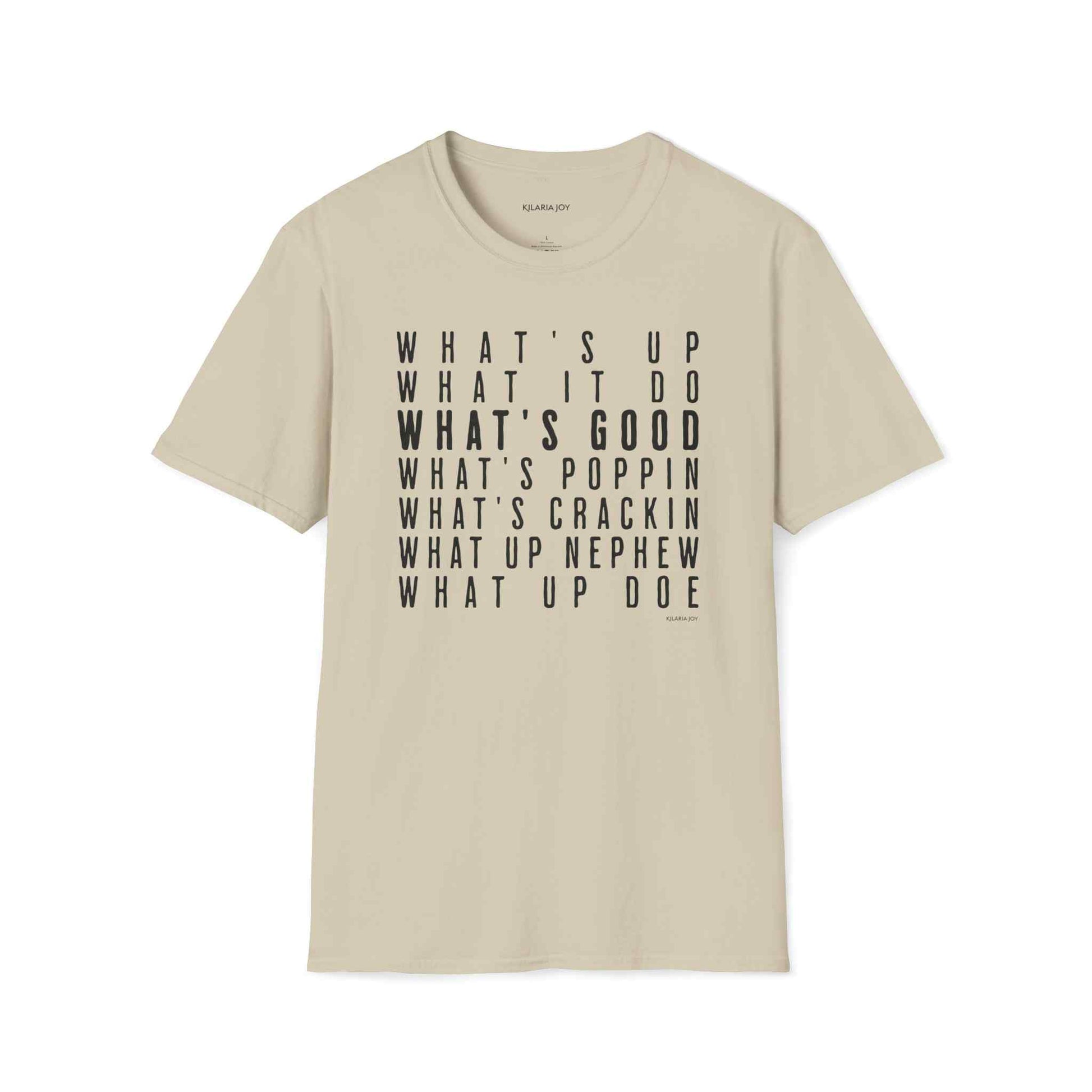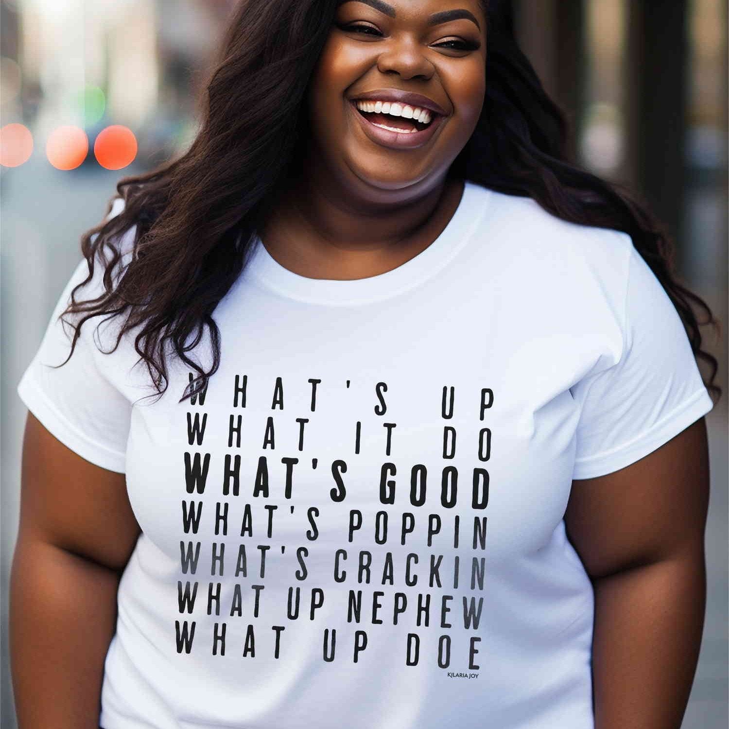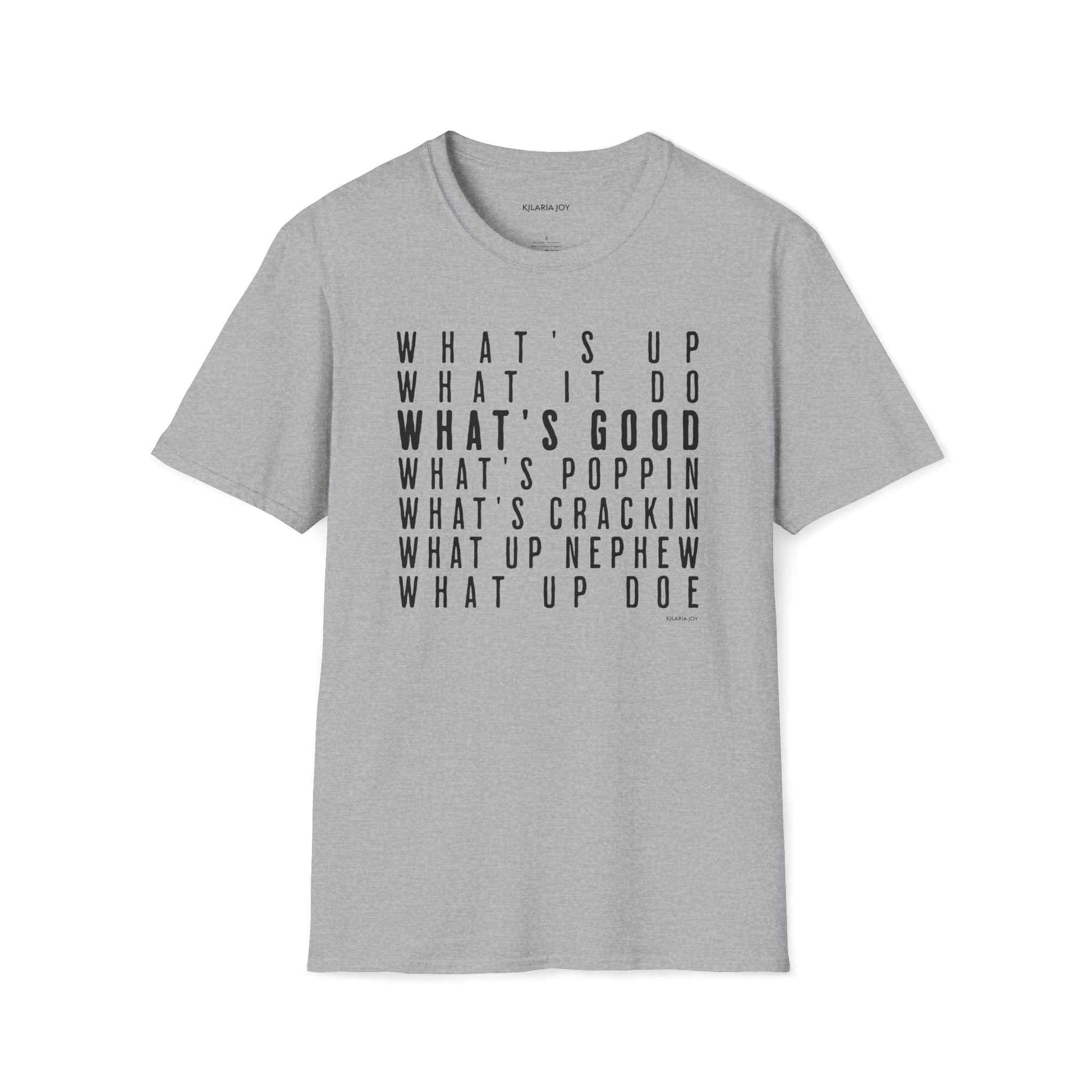 Slide into the 'What's Good' Women's Modern Fit T-shirt and greet the world with all the casual cool you've got stocked up. Enjoy the softness and comfort of this shirt, displaying a collection of greetings that's all about the way we speak, the way we connect, and the way we lift each other up with just a word or two.
